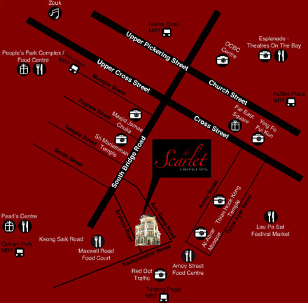 33 Erskine Road Singapore 069333 Tel: +65 6511 3333 Fax: +65 6511 3303 askme@thescarlethotel.com reservations@thescarlethotel.com Online Reservation Getting Around Public carpark facilities are available opposite the hotel. ![]() |